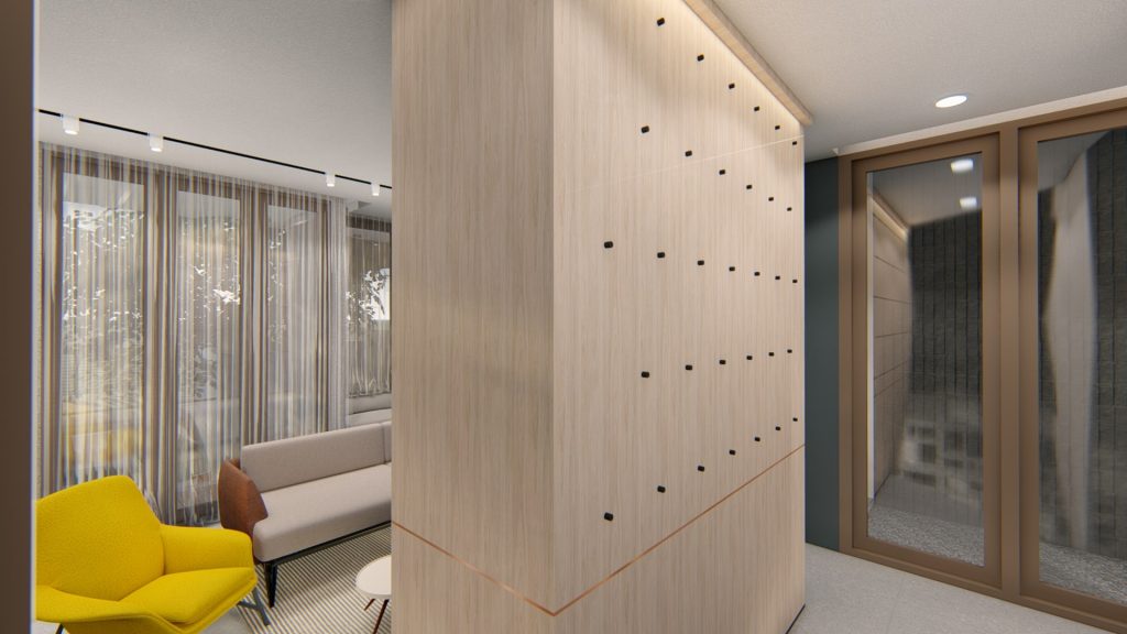 Simplifying the first-floor space. Additionally, giving privacy from the service areas.