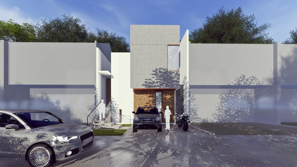 The facade of this house is designed in the basic form of a cube stacked on top of each other. With windows moved to the corners providing privacy for the family.