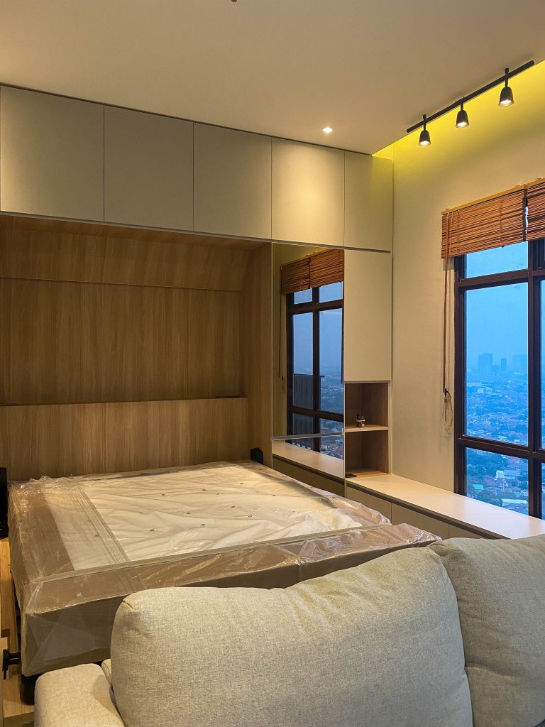 One solution for space optimization is to incorporate a Murphy bed into your apartment renovation