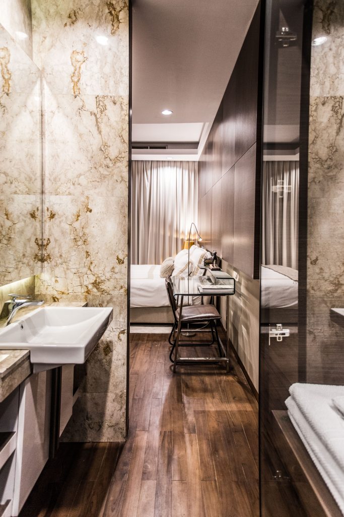 The blend of contemporary style and warm lighting transcends the suite to become sophisticated and inviting.